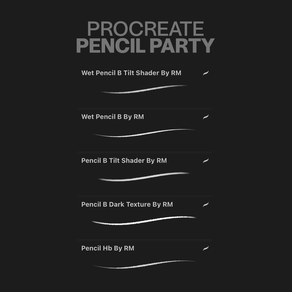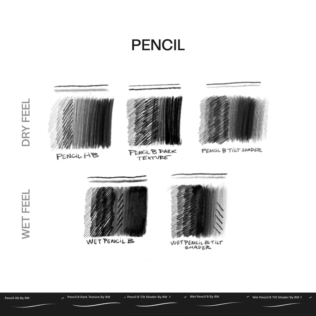 You'll get 10 brushes. 5 pencil brushes and 5 charcoal brushes. 5 pencil brushes. 1) Pencil HB; 2) Pencil B Dark Texture; 3) Pencil B Tilt Shader; 4) Wet Pencil B; 5) Wet Pencil B Tilt Shader; 6) Charcoal texture brush 1; 7) Charcoal texture brush 2; 8) Charcoal brush; 9) Soft charcoal shader brush; 10) Soft charcoal brush