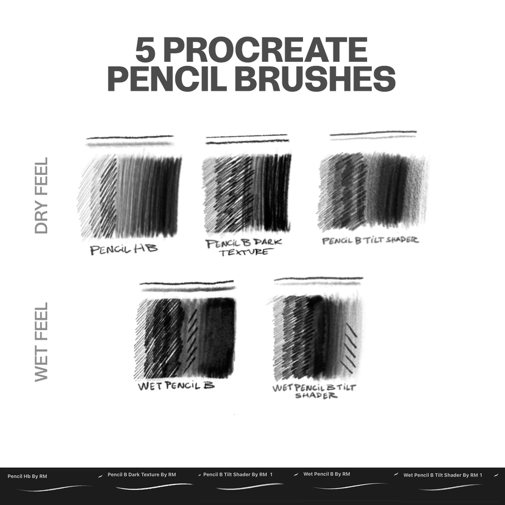 You'll get 5 pencil brushes. 1) Pencil HB; 2) Pencil B Dark Texture; 3) Pencil B Tilt Shader; 4) Wet Pencil B; 5) Wet Pencil B Tilt Shader