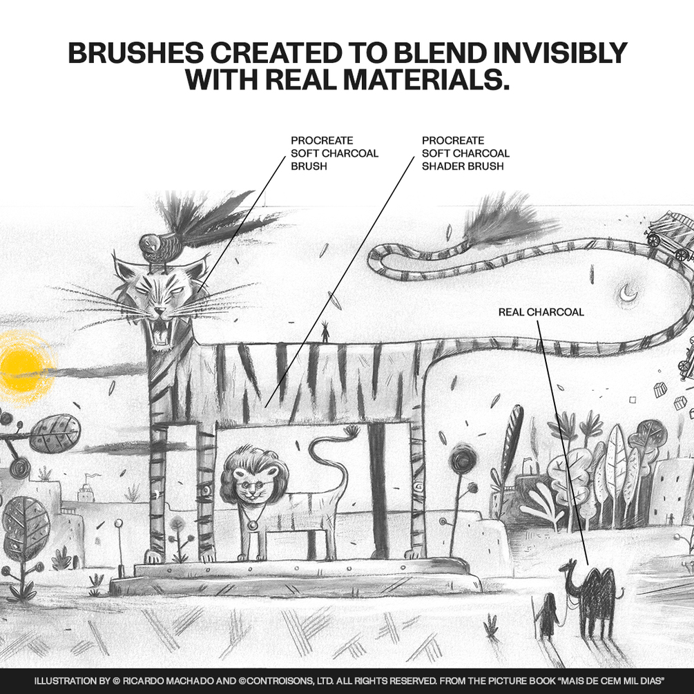 Get a taste of the art of our Procreate Charcoal Brush Set, meticulously perfected during the creation of my book 'Mais de Cem Mil Dias'. Now available for a limited time for just 4 euros, these brushes reproduce the rich textures of real charcoal, ideal for creating black and white illustrations similar to the book's aesthetic.